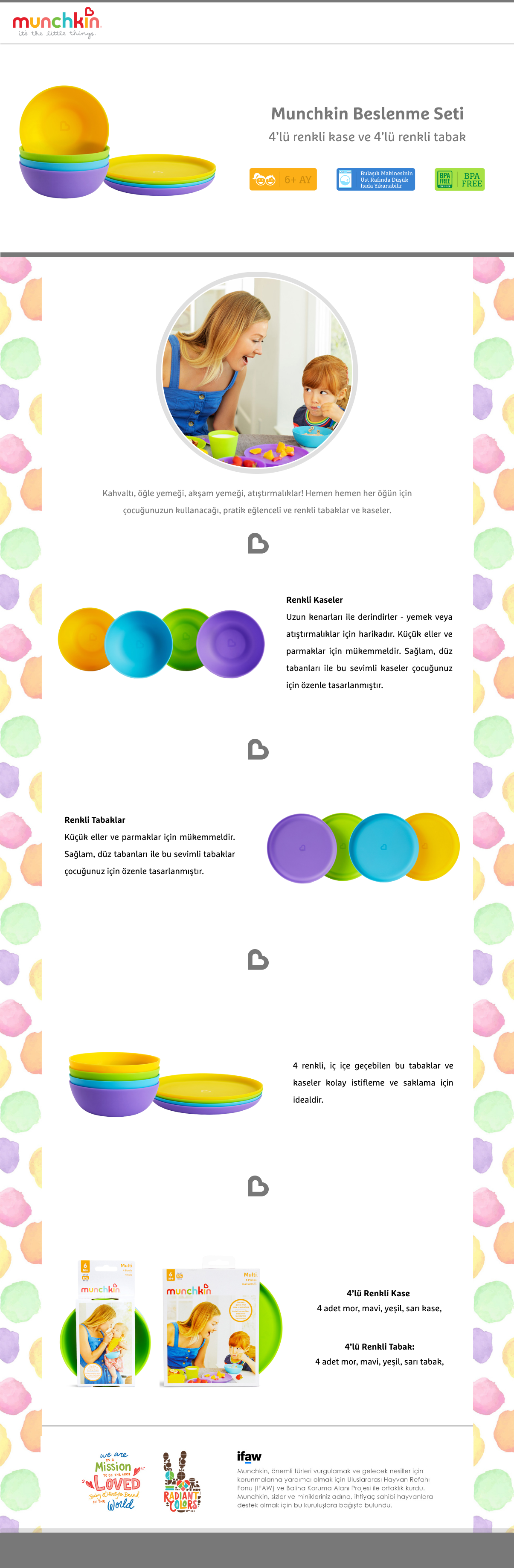 Munchkin Beslenme Seti(4 adet kase ve 4 adet tabak) Renkli,BPA İçermez