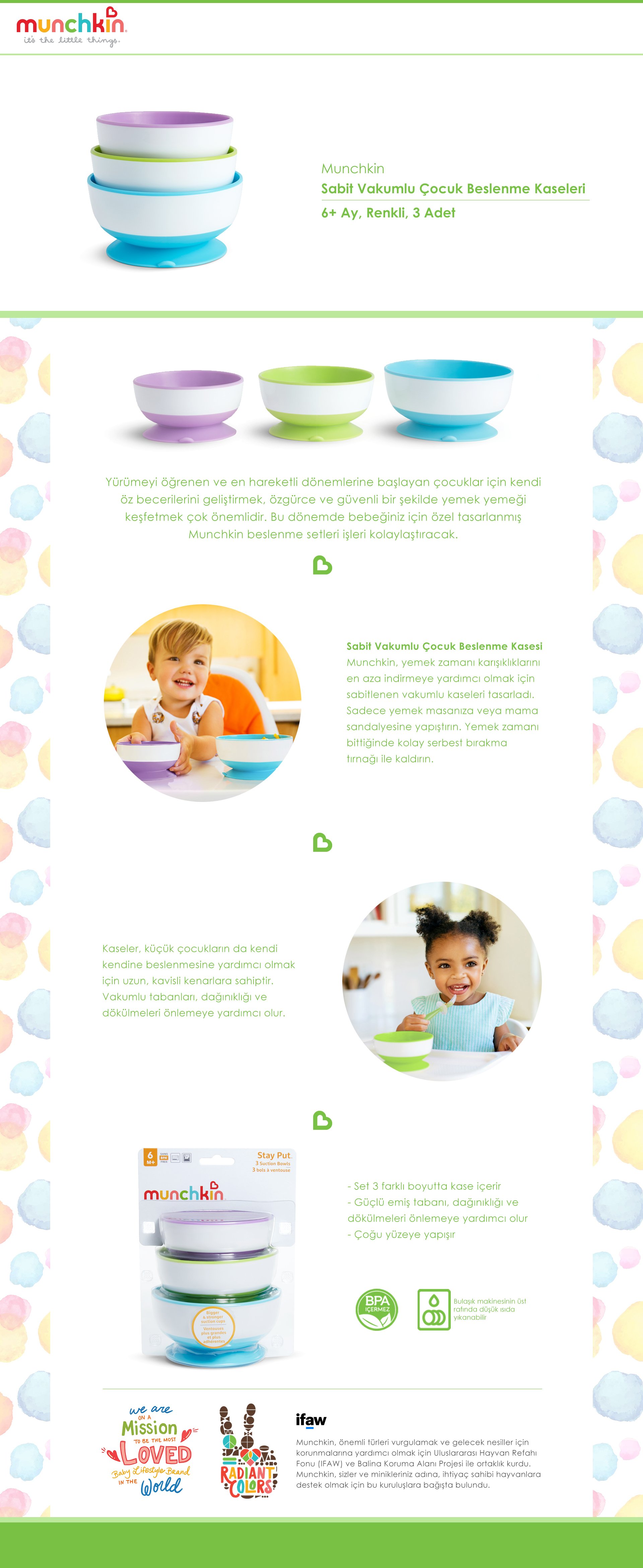 Munchkin 3’lü Vakumlu Beslenme Kasesi | 6 Ay+ | Kaymaz Taban | 3 Boy | BPA İçermez