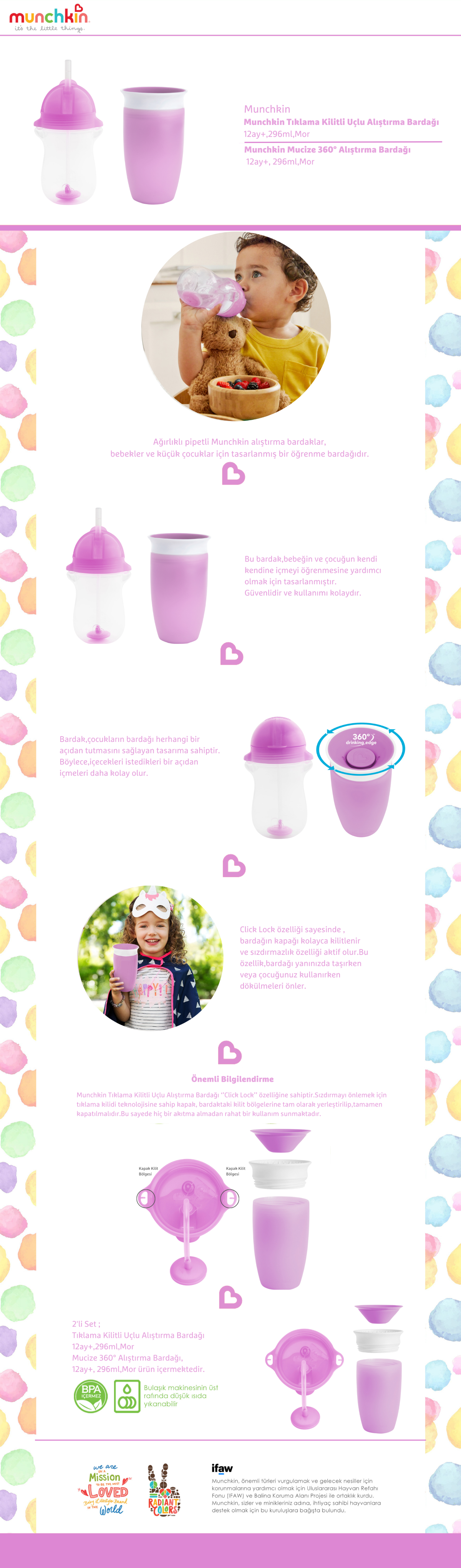 Munchkin tıklama kilitli uçlu alıştırma bardağı 12ay+,296ml,mor +Munchkin Mucize 360° Alıştırma Bardağı, 12ay+, 296ml,mor