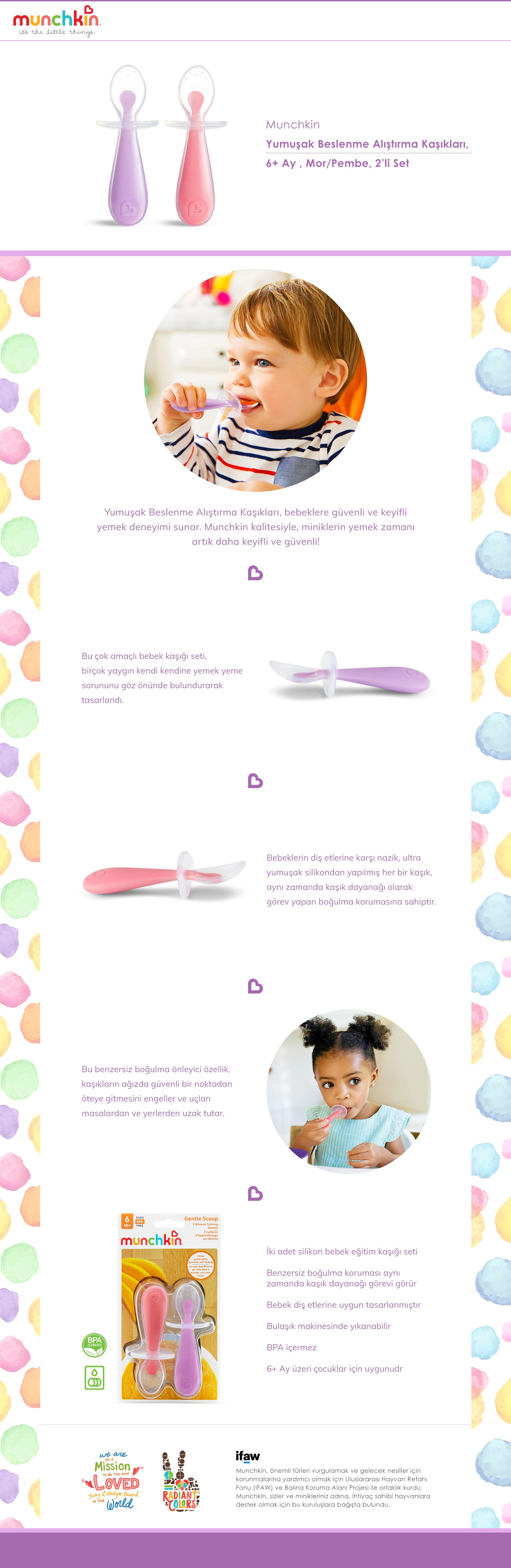 Munchkin Yumuşak Uçlu Alıştırma Kaşıkları – 6 Ay+, 2’li Set, Pembe/Mor, BPA İçermez, Masaya Değmeyen Özel Tasarım